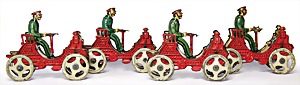 4 pieces racing cars, Vis á Vis, suitable to a French racecourse "Course d´Automobiles", 7 cm, lithographed sheet metal, flywheel-drive, c. 1890, with small scratches on the paintwork that are caused of old age, good condition, 2 cars numbered with 1 and 3, 2 cars without start-number plate, rare
