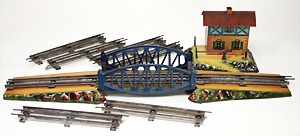 train mixed lot, track 0, electrical version, bridge with 2 ramp parts (old Märklin symbol), some track material parts, 1 house for level crossing attendants, signal is missing, slightly used - good condition