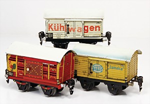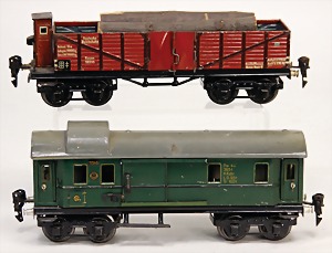 2 pieces, track 0, 4-axled opened freight waggon, with brakeman's cab, 1851, 4-axled mail van, 1854, used