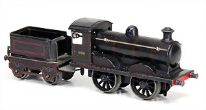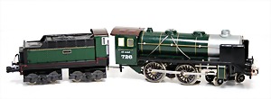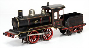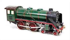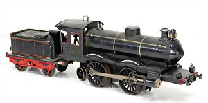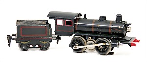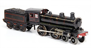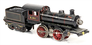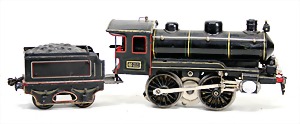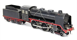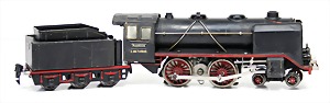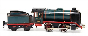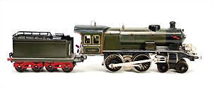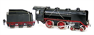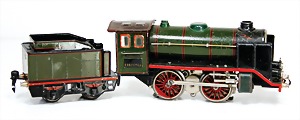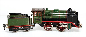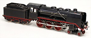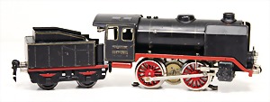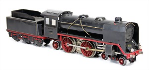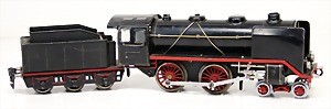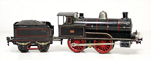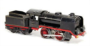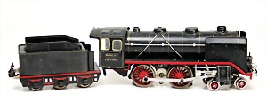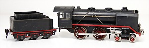 track 0, steam locomotive with separate tender B, 20V, black with red ornamental lines, front was slightly retouched, front lighting is probably more recent, put in