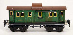 2 pieces, 1861, 2-axled passenger coaches, brown, 2-axled passenger coaches, green, 15 cm, handpainted sheet metal, 1 x roof with scratches on the paintwork, 1 x roof was supplemented, with 1 passenger coaches, green, with stronger scratches on the paintwork, roof was supplemented