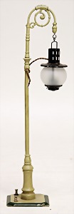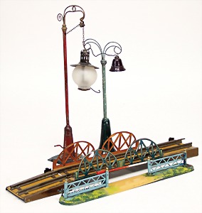 mixed lot of train, different manufacturers, suitable to track 0, bridge, lithographed sheet metal, clock mechanism version, 2-armed lamp, 1 umbrella is missing, Bing lantern, 1 barrier, used