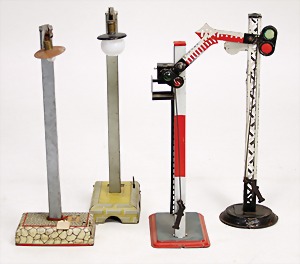 train mixed lot, different manufacturers, 2 signals, 2 lanterns, sheet metal, suitable to track 0 and 1, used