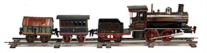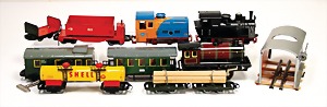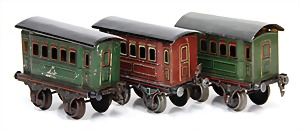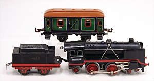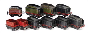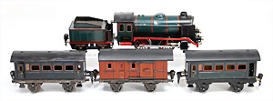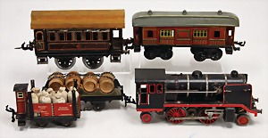 mixed lot train, Carette, 2-axled passenger coaches, track 1, axles were supplemented, strongly used, roof was over painted, tow-tender-locomotive, 1B1, without tender, is stronger used, track 0, Bing, 4-axled baggage coach, lithographed, handpainted roof, good condition, 2 small freight waggons, good