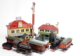 train mixed lot, Bing, Karl Bub and others, 2 stations, house for level crossing attendants, chime, some passenger coaches, 2 tender-locomotives, B-clock mechanism, track material, track 0, used up to stronger used condition, partially with scratches on the paintwork that are caused of old age