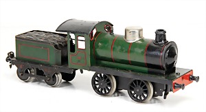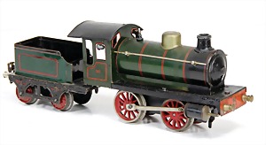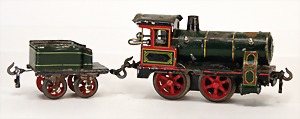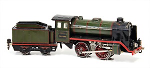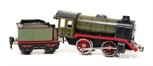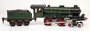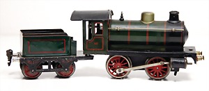track 0, steam locomotive with separate tender B, clock mechanism drive, altered, originally electric drive, Märklin track 0, steam locomotive with separate tender B, green/black with red ornamental lines, 20V, strongly used, partially retouched