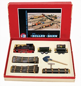 "Die Biller-Bahn", track H0, steam engine B, 1 tiltable tipper lorry, 1 opened freight waggon, track material, spade, original box, very good condition