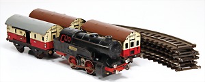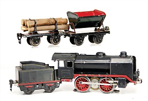 track 1, tow-tender-locomotive B, steam drive, 38 cm, small traces of fire, original condition, with burner, old Märklin symbol, with 1 passenger coaches, 2-axled, age-old, partially over painted, 1 carriage with bulk, age-old, old Märklin symbol, good original condition, 1 some tracks in an old wooden box