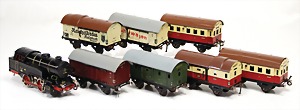 track 0, tender locomotive B, electrical version was colorwise retouched, with 2 passenger coaches, 2 baggage coaches, 3 freight waggons, used