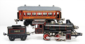 track 0, 3015, steam locomotive with separate tender B, black with red ornamental lines, with tender, with a 4-axled sleeping car, lithographed sheet metal, used, good