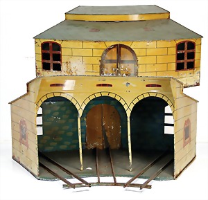 track 1, age-old, 3-part locomotive shed, handpainted sheet metal, 68 cm wide, 32 cm tall, the scratches on the paintwork are caused of old age, partially with patches of rust