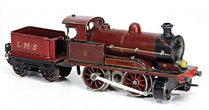 track 0, steam locomotive with separate tender 2B, clock mechanism drive, clock mechanism is intact, used, the forerunner was supplemented, stripes and inscription are worn