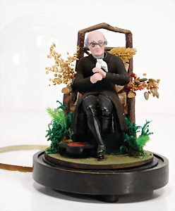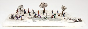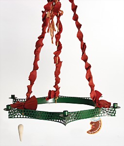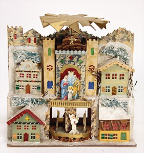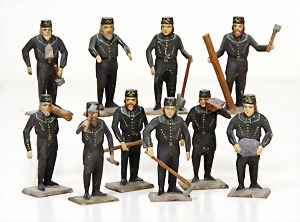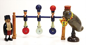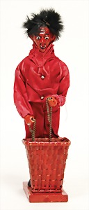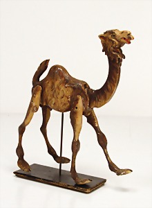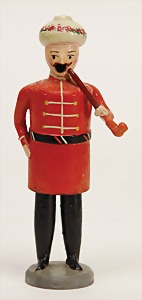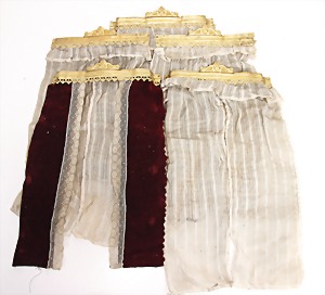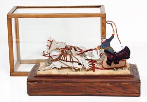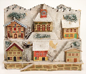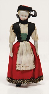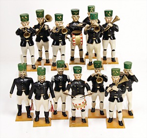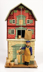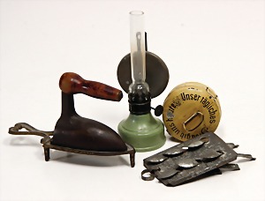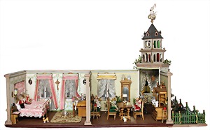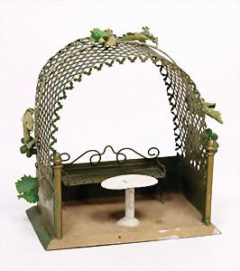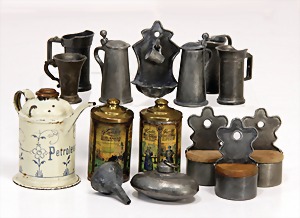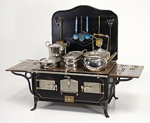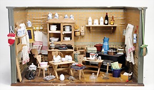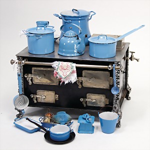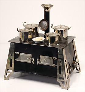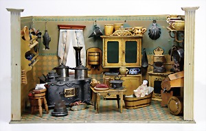 stately doll kitchen, c. 1890, width: 1.38 m, height: 50 cm, depth: 61 cm, original wallpaper at wall and floor, wallpaper at floor is caused of old age worn at edge, furnished, richly equipment, porcelain parts, tin parts, copper and brass, 1 butter machine, representative stove from that period, funnel can be fixed behind the kitchen, water vessel, pot set isn't original, pudding form, the last time it was used in the '30s, according to the original owner the doll kitchen was only used at Christmas