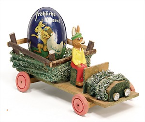 Easter bunnys car, wood, with mass Easter bunny and Easter egg, lithographed sheet metal, 32 cm