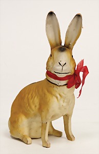 Easter bunny, papier mâché, Candy container, with egg in the pinafore, 22 cm