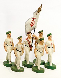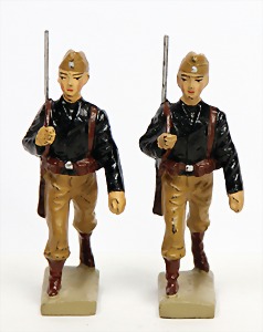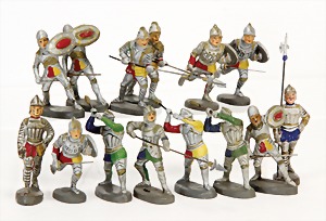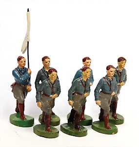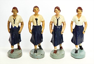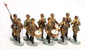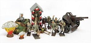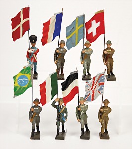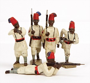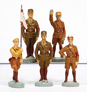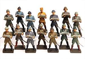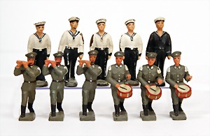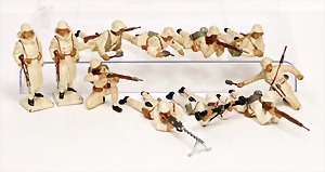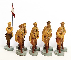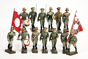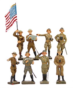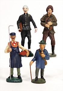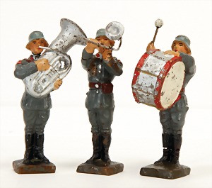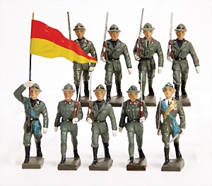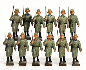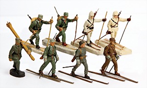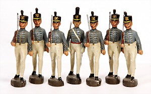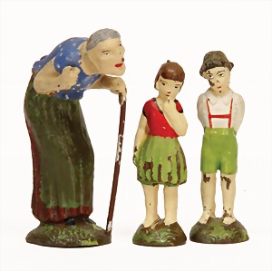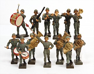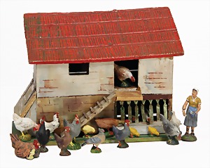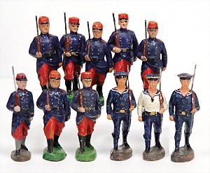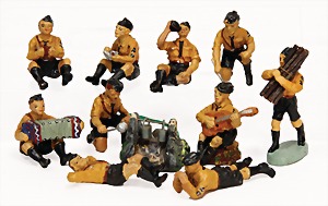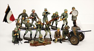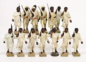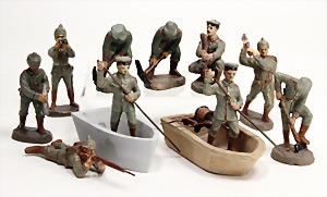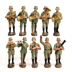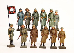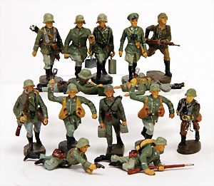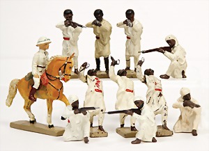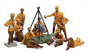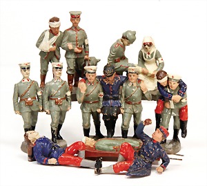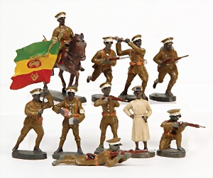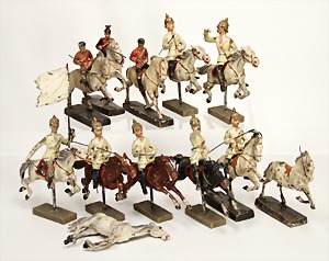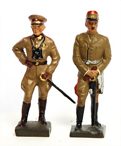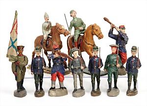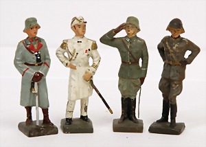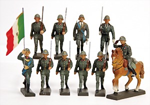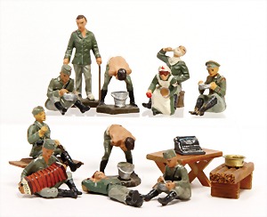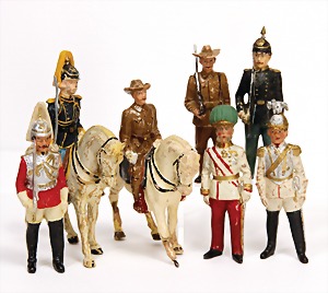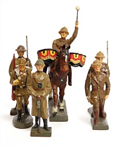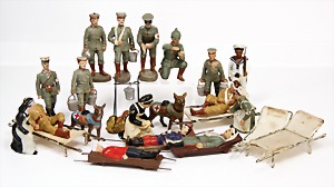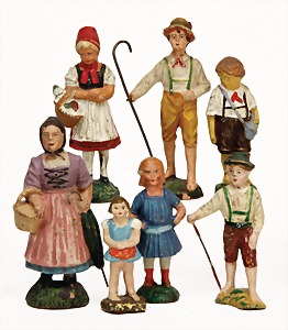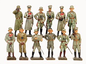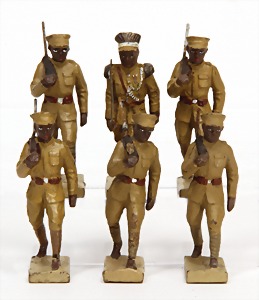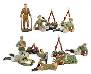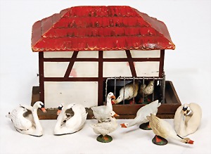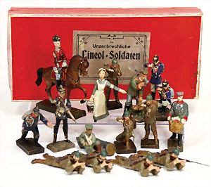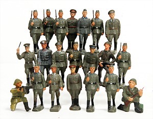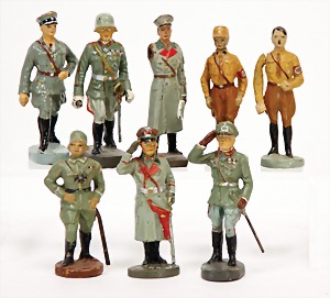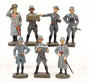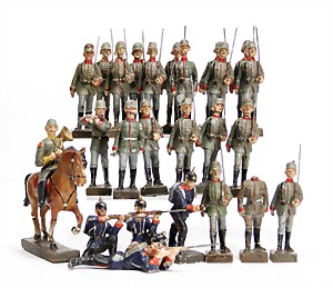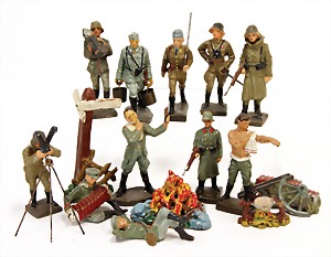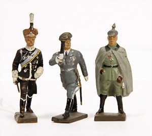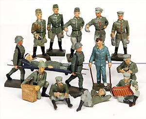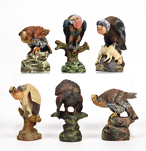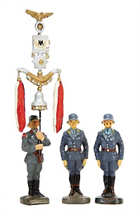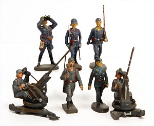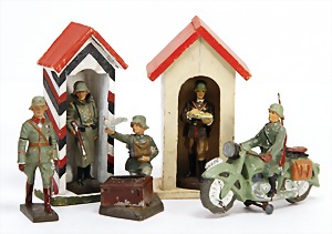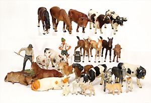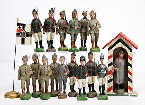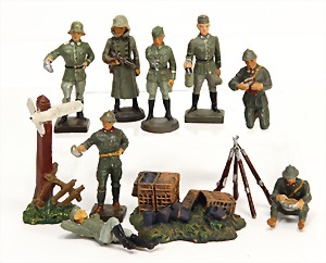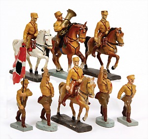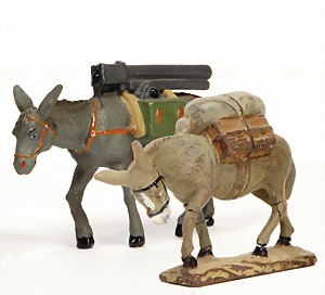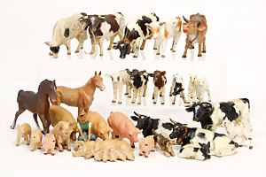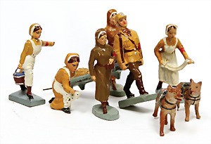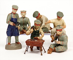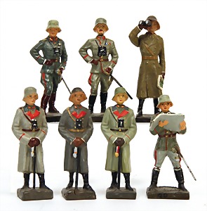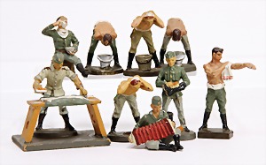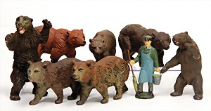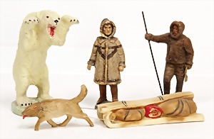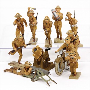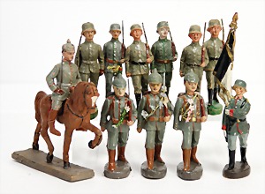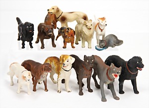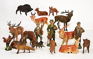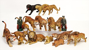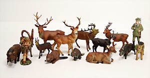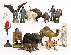 8 Teile, Wildtiere, Masse, Affe, Schildkröte, Luchs, Truthahn, Büffel, Zust. 2, Lackfehler an der Schildkröte, 1 Kamel Zust. 3 – 4, 2 Wärterfiguren, Masse, 9 cm, Lineol, Zust. 3, 3 Figuren Kunststoff, 1 Papagei auf Papageienständer