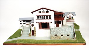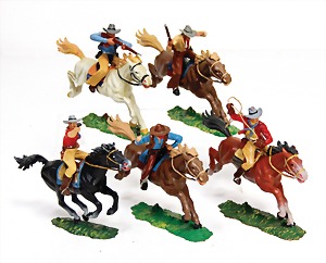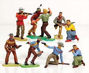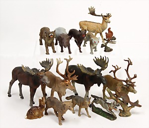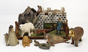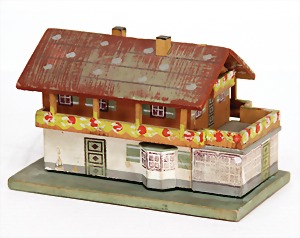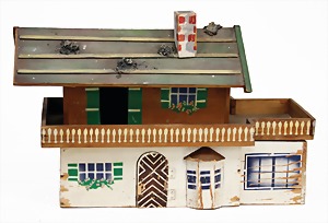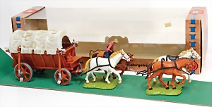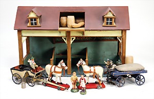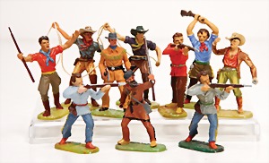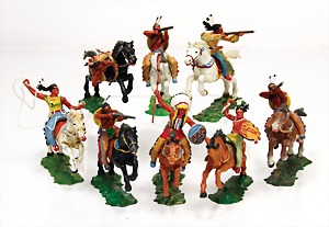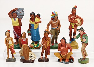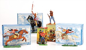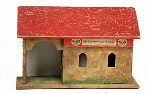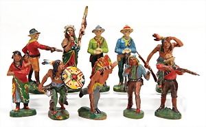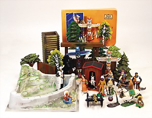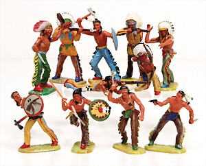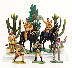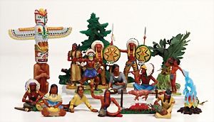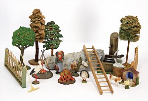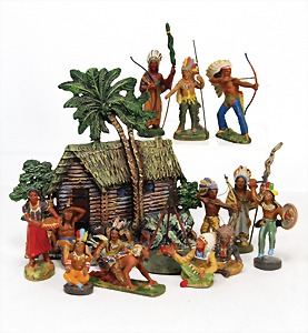 Blockhütte, mit Palme, Masse, Zust. 1 - 2, dazu Indianer, meist Elastolin u. Lineol, meist Zust. 2, ein paar Figuren schlechter, 1 Reiter ohne Pferd