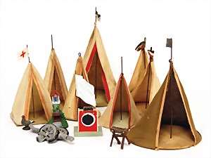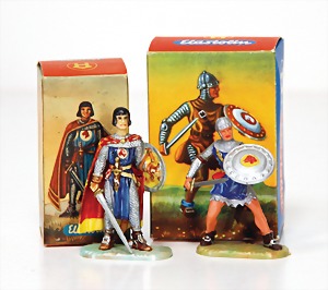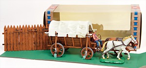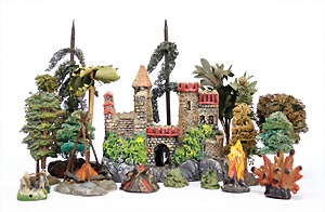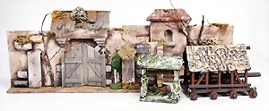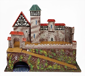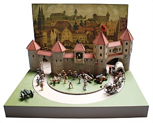 Diorama, Holz, Stadtmauer mit Hintergrund und sich drehender Scheibe, 1 m breit, 89 cm tief, 71 cm hoch, schöne Dekorationen für Ritter.Figuren, dazu 1 Nomannenwagen, Elastolin, Kunststoff, marschierend, 2 Kanonen, Kleinteile