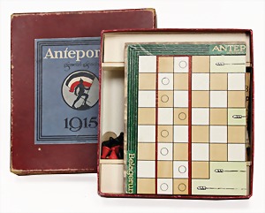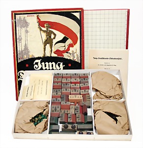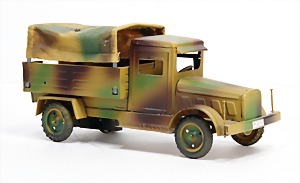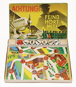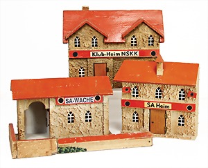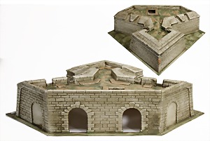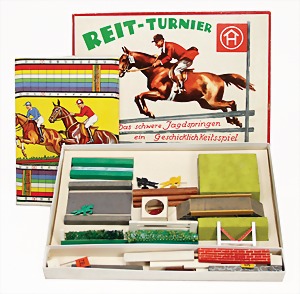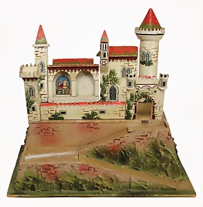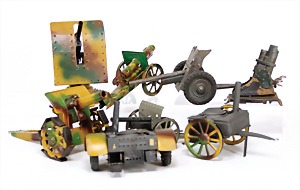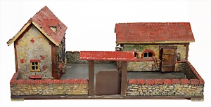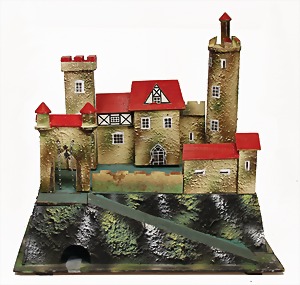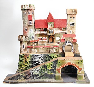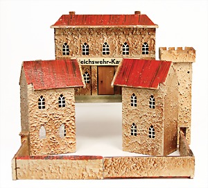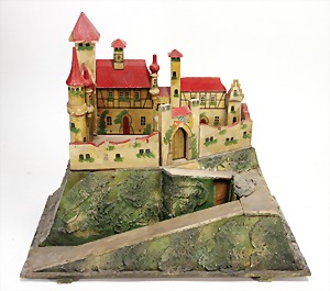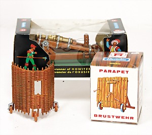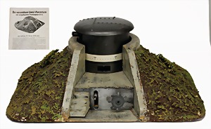 "Der versenkbare Lineol-Panzerturm", mit eingebautem Festungs-Geschütz, Holz/Masse, sowie Blech-Teile, Grundplatte 45 x 44 cm, guter Zust., selten, mit Anleitung