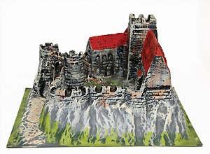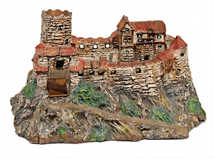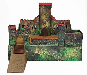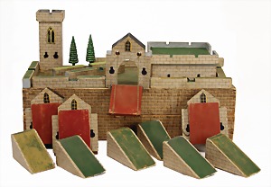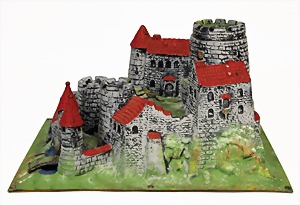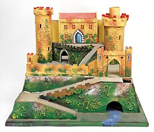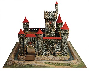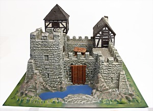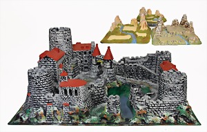 Elastolin, Kunststoff, gr. Burganlage mit Wassergraben, Grundplatte: 70 x 78 cm, Brunnen, Zugbrücke, Türme, Orig.-Kart. zu Burgaufbau zu 97945, sehr guter Zust.