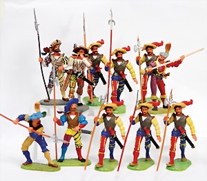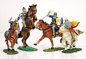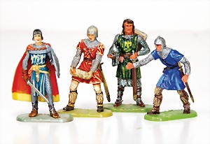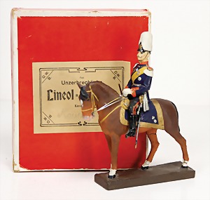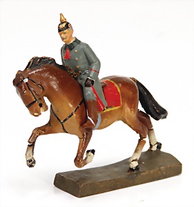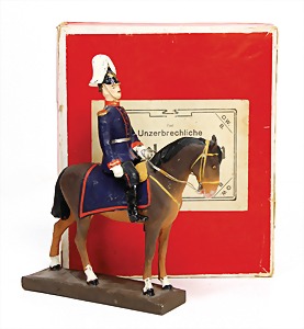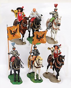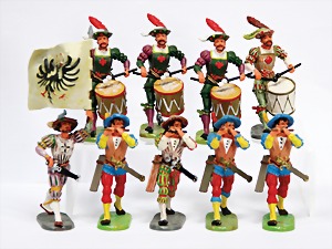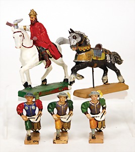 Götz von Berlichingen, "Der Ritter mit der eisernen Faust", Masse, Faustspitze vorne weggebrochen, dazu 3 Figuren Lineol, Masse, 7 cm, Trommler, selten, 1 Masse-Pferd, Lineol, ohne Reiter, Zust. 2