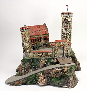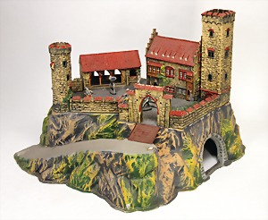 Ritterburg, Elastolin/Kunststoff, mit Tunnel, Durchgang: 11 cm, insgesamt H: 43 cm, Zugbrücke, ein kl. Mauerstück fehlt, 5 Elastolin/Masse-Ritter, H: 7 cm