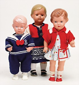 3 Puppen, 1 Christel, gem. 36/41, Ursel, gem. 40, Inge, fester Kopf, gem. 35, kl. Riss am linken Oberarm