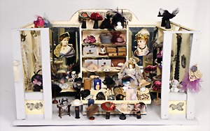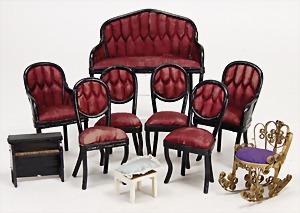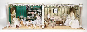 2-tlg. Puppenstuben-Gehäuse, 93 x 40 x 32 cm, mit Durchgangstür, teilw. alte Tapete, einige Teile ergänzt u. überstrichen, 2 Fenster verglast, mit Messing/Blech-Schabraken geprägt, als Brautmodeladen eingerichtet, mit 1 Sitzgarnitur, Holz, mit Blüten besetzt, handbemalt, Stoff wohl nachtr. ergänzt, Möbel gem. Mühlhauser Wien, Couchgarnitur, 2 Stühle, 1 Hocker, 1 Tisch, dazu reichh. Zubehör, meist neuer