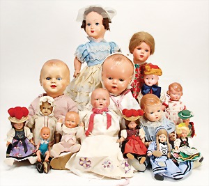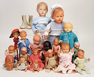Händlerkiste, Puppen, meist Celluloid, darunter Schildkröt Strampelchen, gem. 50, kl. Trachtenpuppen, Inge, fester Kopf, gem. 25 ½, u. anderes