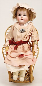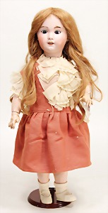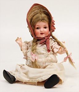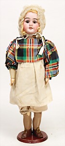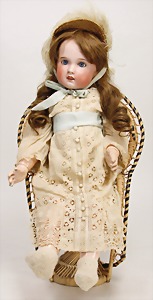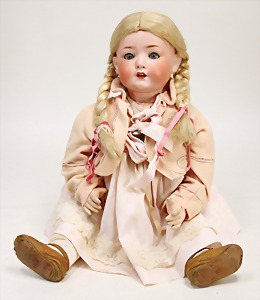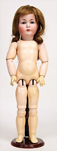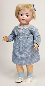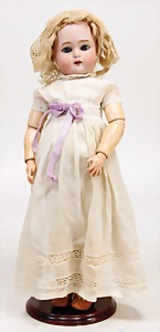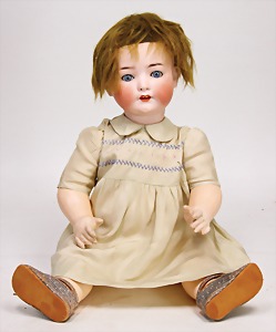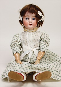 Porzellankopf-Puppe, gem. Germany 914.10, blaue Glasaugen, lose, off. Mund, Zähne fehlen, Echthaarperücke, auf Masse-Gliederkörper, mit Kugelgelenken, Körper stärker bespielt, linke Hand restauriert, 63 cm, Abplatzer am linken Ohr, Kleidung nachgenäht