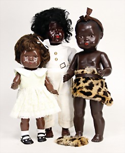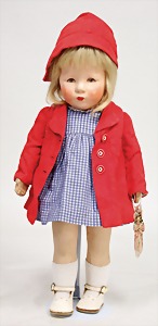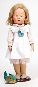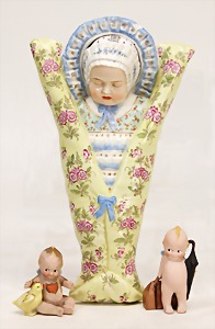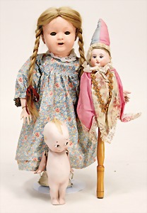 3 Teile, Masse-Puppe, mit Echthaarperücke, blaue Schlafaugen, off. Mund, 2 Zähne oben, etwas Farbabrieb an Kinn u. Nasenspitze, auf Masse-Toddlerkörper, einige Finger ausgebessert, 35 cm, 1 Kewpie, O´Neill, 17 cm, 1 Marotte, Porzellankopf, blaue fest eingesetzte Glasaugen, mit Stimme, 30 cm