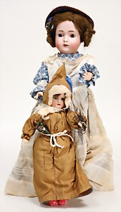 2 Porzellan-Puppen, 1 x gem. 136 5, braune Schlafaugen, off. Mund, Zähne, Echthaarperücke, auf Masse-Gliederkörper, mit Kugelgelenken, 1 Finger weggebrochen, 60 cm, 1 x Heubach Köppelsdorf, Nr. 250.13, blaue Schlafaugen, off. Mund, Zähne, Mohairperücke, Masse-Gliederkörper, als Nikolaus gekleidet, ca. 29 cm