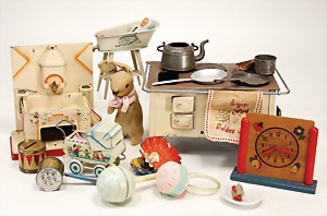 Fundkiste, Blech-Waschbecken mit Auslasshahn, wohl Kibri, altersbed. Roststellen, H: 18 cm, B: 17 cm, dazu Puppen-Blechbadewanne, H: ca. 14 cm, kl. Blech-Puppenwagen, Made in U.S.-Zone, Germany 143, 1 Stoff-Hase, Hersteller?, ca. 15 cm, 3 Rasseln, 2 x Celluloid, 1 x Blech, 1 Kinder-Lernuhr, Holz, 2 kl. Blech-Förmchen, 1 Puppenherd, Blech,, Töpfesatz fehlt, 23 x 14 x 16 cm