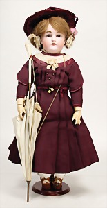 Porzellan-Brustblattkopf-Puppe, gem. 13.147, braune Schlafaugen, off. Mund, Zähne, Kopfdeckel fest aufgesetzt, von außen keine Risse erkennbar, Transportrisiko f. den Augenmechanismus beachten, Echthaarperücke, auf Lederkörper, Masse-Arme, 60 cm, Kleidung alt bzw. aus alten Stoffen nachgenäht, alte Lederschuhe, dazu 1 Puppenschirm, Bespannung Seide, Griff Bein, 55 cm