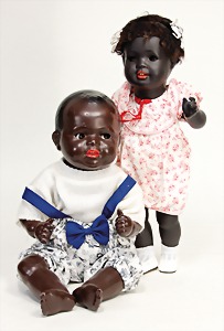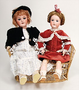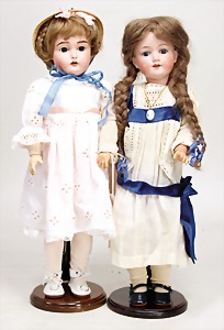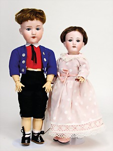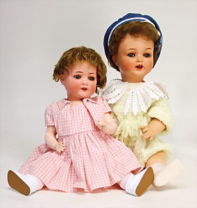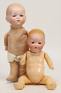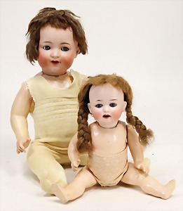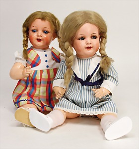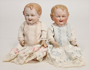 Zwillingspaar, Ganzbiskuit, ausmodellierte Frisuren, gemalte Augen, off./geschl. Mund, modellierte Zähne, auf Ganzbiskuit-Körper, bewegl. Arme u. Beine, 1 x rechte Hand überstrichen, Daumen fehlt, 1 x beide Hände überstrichen, 1 Daumen fehlt, Beine nachmodelliert, 27 cm, fester Kopf