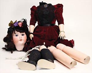 Porzellankopf-Puppe, gem. Germany 390A14M, blaue Glasaugen, müssen neu eingesetzt werden, off. Mund, Zähne, Echthaarperücke, auf Masse-Gliederkörper, mit langen Röhrenoberschenkeln, Beine lose, müssen neu aufgezogen werden, 2 Finger fehlen, ca. 90 cm, Kleidung nachgenäht