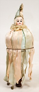Marotte, Porzellankopf, blaue fest eingesetzte Glasaugen, Mohairperücke, Seide etwas verschlissen, mit Glöckchen, ca. 28 cm