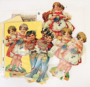 gr. Konv. Obladenbilder, alt, Motiv Mädchen u. Junge mit Lebkuchenherz, Mädchen mit Puppe, H: ca. 27 cm