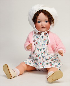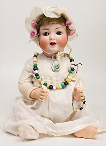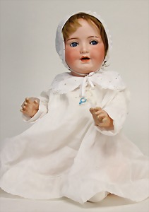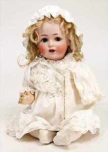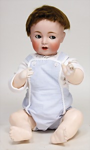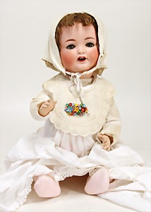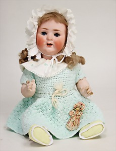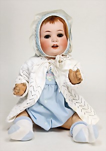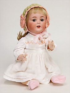 Porzellankopf-Puppe, gem. Germany 990 A.12.M, blaue Schlafaugen, off. Mund, 2 Zähne oben, Mohairperücke, auf Masse-Sitzbabykörper, mit abstehendem Zeh, einige Finger geklebt, 55 cm