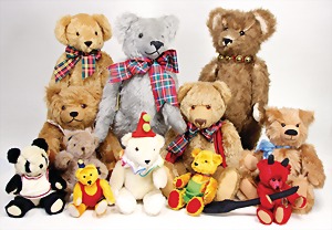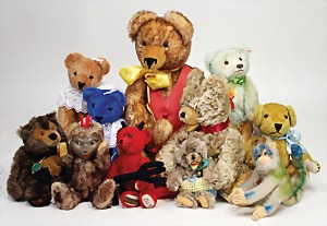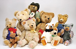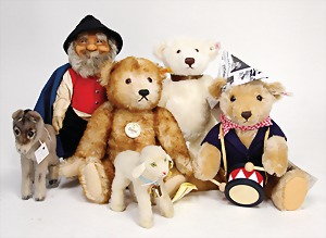 Konv. 6 Plüschtiere, 3 Bären, neu, 2 x Replika, 28 cm u. 35 cm, kl. Esel, 1 Schaf Lamby, mit Knopf, Schild u. Fahne, Nr. 3450/14, dazu 1 Schäfer, Gesicht Vinyl, bespielt, 31 cm