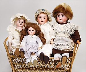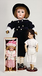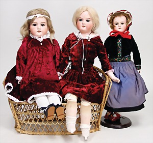 3 Puppen, 2 x Porzellan, 1 x gem. W Germany 10, braune fest eingesetzte Glasaugen, off. Mund, Mohairperücke, Masse-Stehkörper, mit anmodellierten Schuhen u. Strümpfen, 21 cm, 1 x Heubach, Nr. 8192, Augen nachtr. eingesetzt, off. Mund, Zähne, Echthaarperücke, einfacher Masse-/Holzgliederkörper, Unterschenkel ergänzt, ca. 48 cm, 1 Holzpuppe, blaue fest eingesetzte Glasaugen, aufgeklebte Echthaarperücke, Holz-Gliederkörper, 32 cm