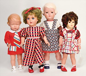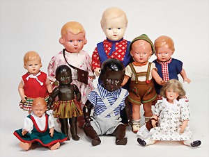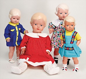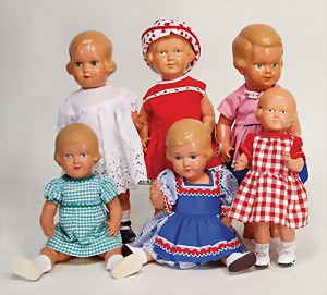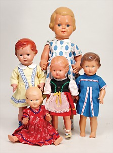 5 Celluloid-Puppen, bespielt, Inge, fester Kopf, 42, Bärbel, gem. 45, Beine wohl ergänzt, Erika, 49, Christel, gem. 50/56, dazu 1 Mädchen, mit Schlafaugen, gem. 48