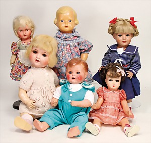 6 Celluloid-Puppen, zw. 31 – 42 cm, 2 x mit festem Kopf, modellierte Frisuren, guter Zust.