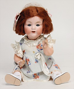 Porzellankopf-Puppe, gem. Made in Germany J.D.K. 257, braune Schelmenaugen, off. Mund, 2 Zähne oben, Mohairperücke, auf Masse-Sitzbabykörper, mit abstehendem Zeh, 2 Finger bestoßen, linker Arm fehlt, 41 cm