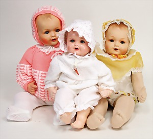 3 Masse-Einbindekopf-Baby, mit Stoffkörper, 2 x mit Masse-Armen u. –Unterschenkeln, Schlafaugen, off. Mund, 41 cm, 50 cm, 55 cm
