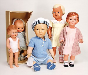 Konv. 5 Celluloid-Puppen, versch. Hersteller, darunter Celluloid-Baby, von Maar, auf Masse-Körper, 36 cm, im Orig.-Kart., 1 x Bruno Schmidt, gem. 45, 3 x Minerva, Junge, gem. 52, 2 x Mädchen, 34 cm u. 50 cm