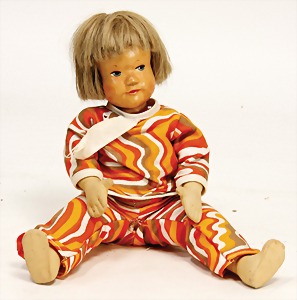 Holzkopf-Puppe, Echthaarperücke, Stoffkörper, bewegl. Arme u. Beine, 32 cm, bespielt