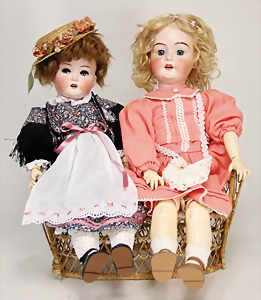 2 Porzellankopf-Puppen, 1 x Heubach Köppelsdorf, gem. 300.5, blaue Schlafaugen, off. Mund, 2 Zähne oben, Echthaarperücke, auf Masse-Stehkörper, bewegl. Arme u. Beine, Fußspitzen bestoßen, 31 cm, 1 x Kämmer & Reinhardt, gem. Simon & Halbig 126, blaue Schelmenaugen, off. Mund, 2 Zähne oben, Zunge, Echthaarperücke, auf Masse-Stehbabykörper, stärker bespielt, Hände überstrichen, 50 cm