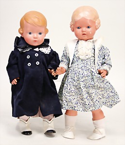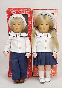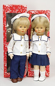 Puppenpaar, Kunststoffkopf, Echthaarperücke, Stoffkörper, im Matrosenanzug, 35 cm