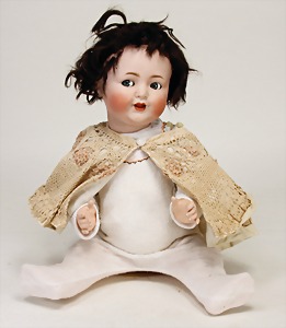 Porzellankopf-Puppe, gem. 22 Germany 11, blaue Schlafaugen, off. Mund, 2 Zähne oben, Zunge, Kinngrübchen, Echthaarperücke etwas ausgegangen, auf Masse-Sitzbabykörper, mit abstehendem Zeh, Körper überstrichen, teilw. alte Kleidung